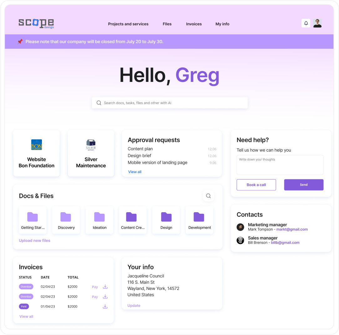 Striving for visual innovation, an efficient design process is crucial for standout client work. Our customized client portal will integrate all collaboration, boost productivity 20% and strengthen relationships, becoming an essential asset for our boutique firm.