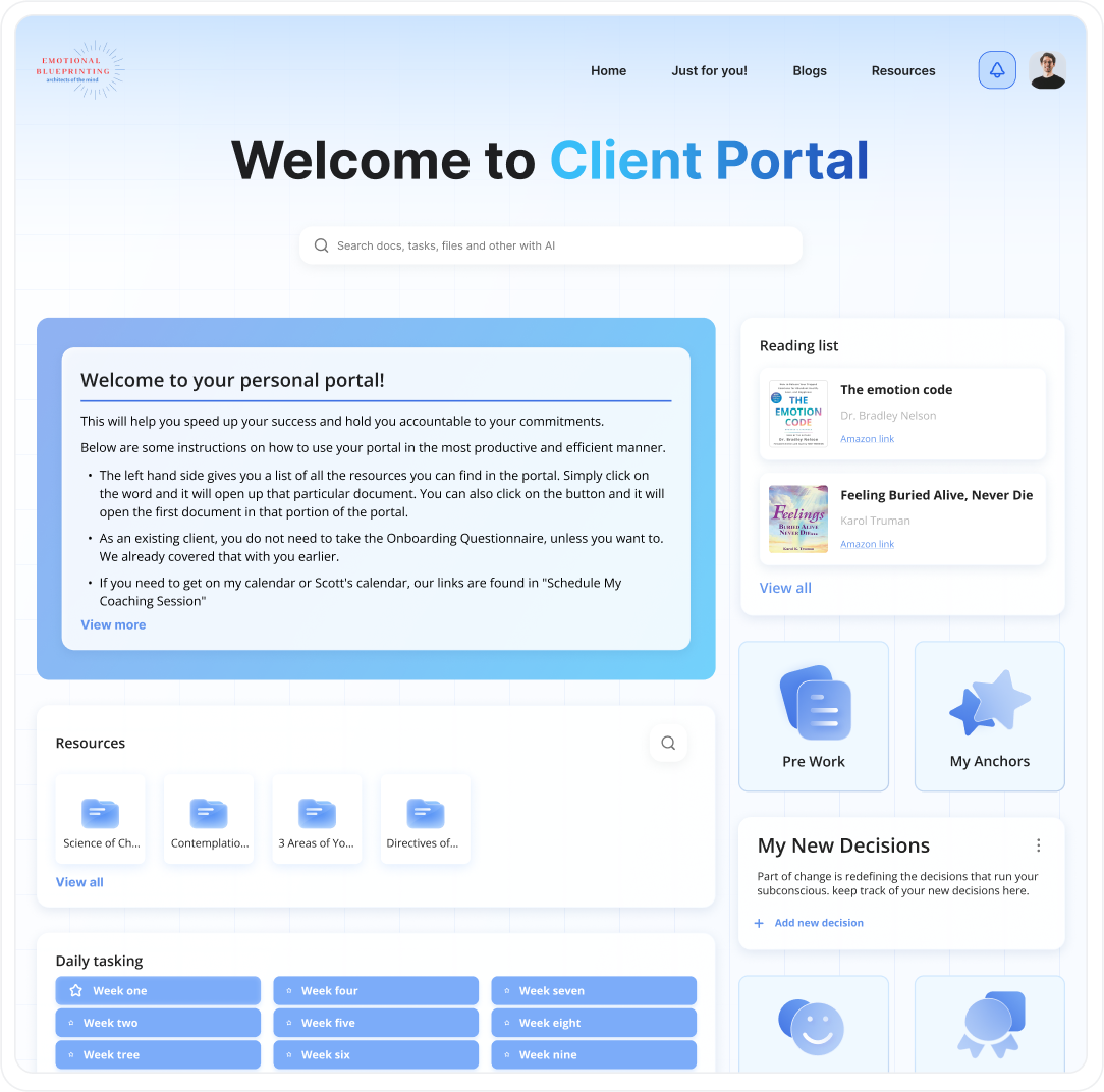 As a coach devoted to client growth, our customized portal organizes all client interactions, freeing me to focus on their needs. With robust features optimizing my workflow, I can strengthen relationships and improve outcomes, elevating my consultancy.