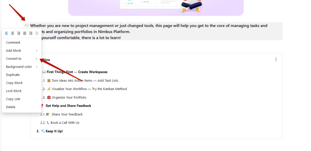 It’s very simple and quic to work with blocks. Just select the menu, and an options list will appear.
