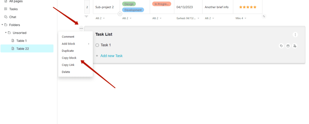 The feature works for all block types: text, pictures, files, tables, and so on! Copy blocks in a couple of clicks! Just go to the block menu and select Copy block.