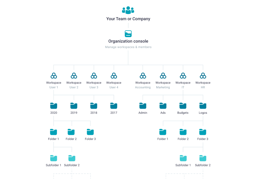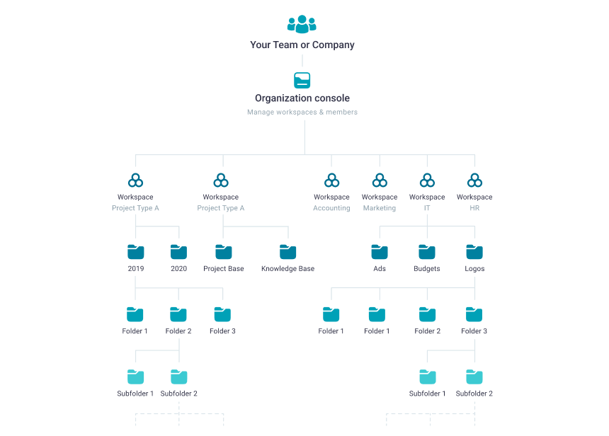 Create as many isolated workspaces as you need with teams and different access levels for every workspace.